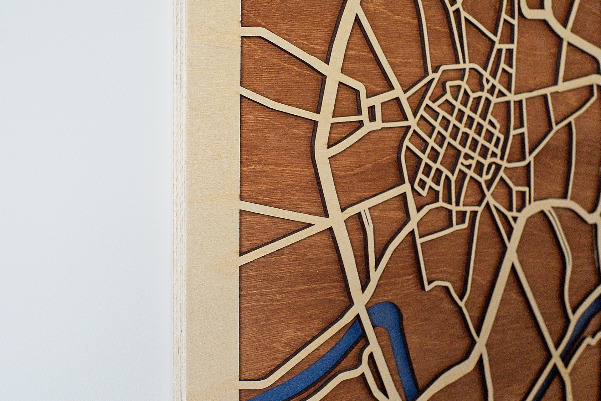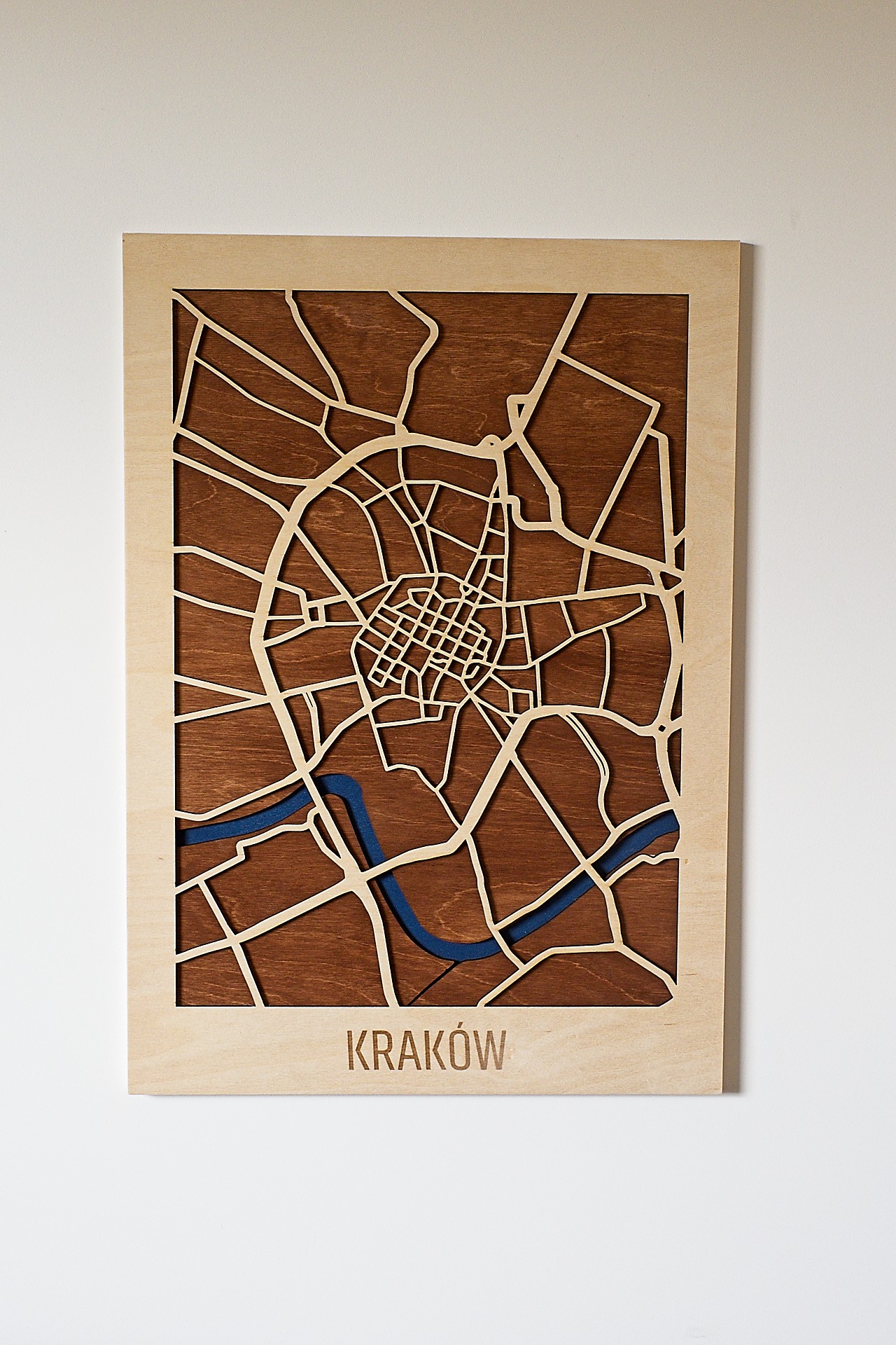 Wzór wycięty w naturalnym drewnie przedstawia układ miasta – Rynek Główny, Planty, zakole Wisły, Kazimierz i Podgórze. Wszystko to zanurzone w głębokim kontraście ciemnych barw i ciepłego światła drewna. Elegancki, ale nie chłodny.