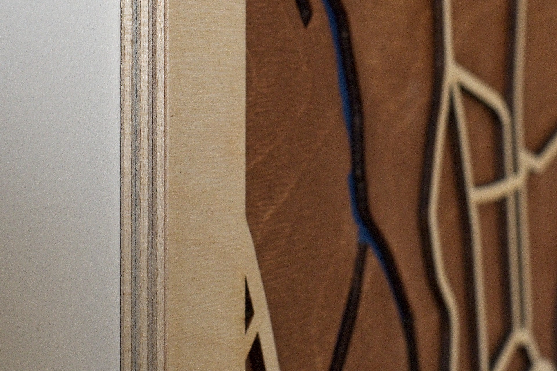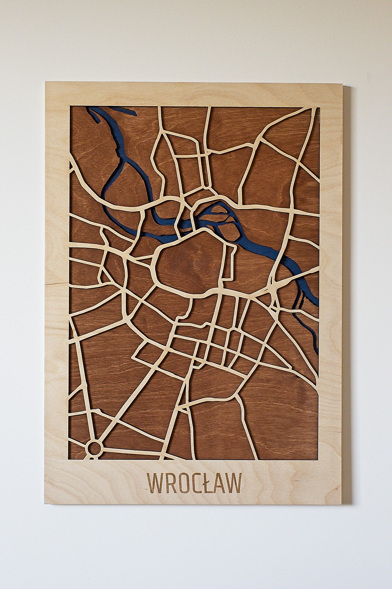 Głębokie odcienie i naturalna faktura drewna oddają złożoność miasta nad Odrą. Rysunek mostów, kanałów i placów został precyzyjnie wycięty i złożony warstwowo, tworząc subtelną strukturę, która zachwyca z bliska i z daleka.